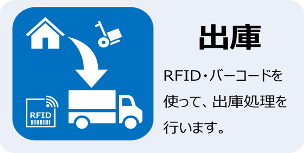 物品マスタに記録されている出庫情報をもとにRFIDリーダ、バーコードリーダを使用し出庫記録を行います